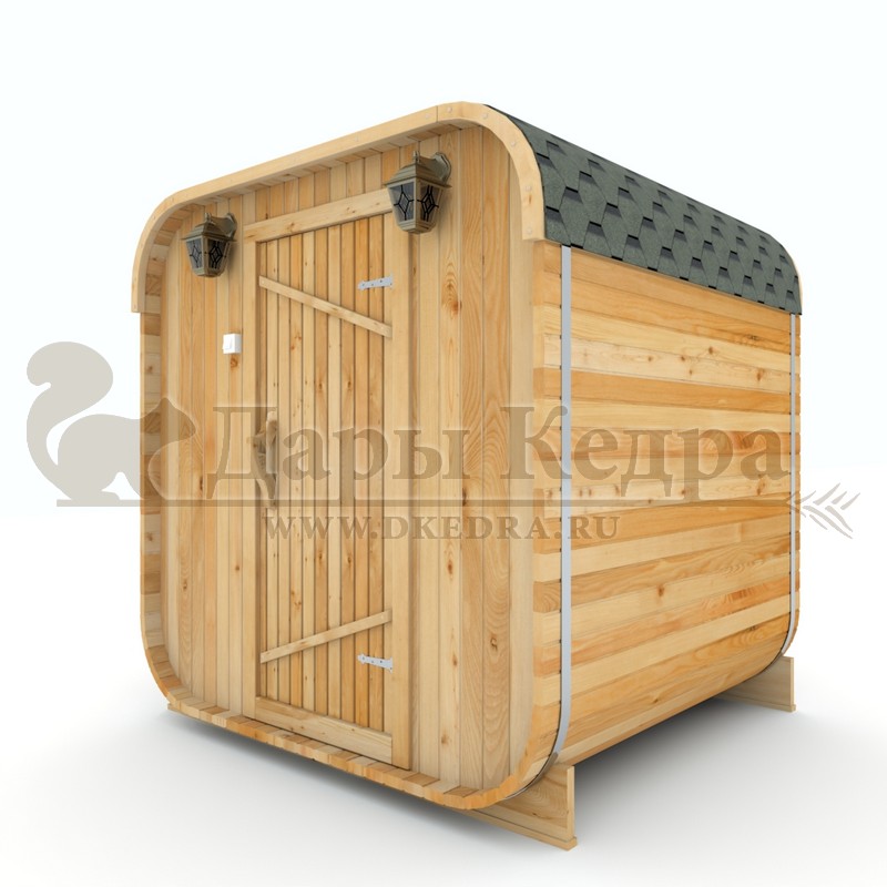 Баня-бочка квадро из кедра 3 метра Это квадратное изделие с закругленными углами. За счет такой конструкции во время топки воздух циркулирует по кругу, поэтому баня-бочка нагревается не более 30 минут. Баня включает в себя раздевалку и парилку. Лавочки из кедра установлены по всей длине бани-бочки с обеих сторон. Печь расположена в парилке около дальней стены. Для удобства пользования в раздевалке находится вешалка и полочка из кедра. По вашему желанию баню-бочку квадро можно укомплектовать козырьком, верандой и печью с внешней загрузкой, благодаря которой весь мусор после топки остается на улице. Баня-бочка квадро не требует полноценный фундамент, поэтому при необходимости ее можно перенести в другое место. Обращаем Ваше внимание, что в стандартную комплектацию бани входят лавки в парной с обеих сторон. Дополнительно можно заказать полок открытого или закрытого типа! Кедр обладает ароматическими свойствами. Он не деформируется и влагоустойчив, при правильном уходе за деревом на нем не развиваются грибки и плесень.