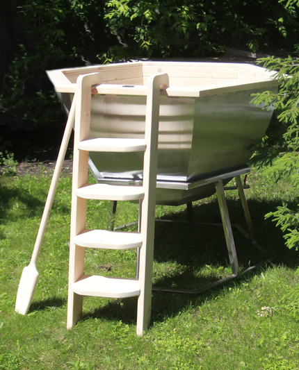 Банный чан из нержавеющей стали Ø-2000 на подставке с приставной печью Банный чан с приставной печкой изготовлен из пищевой стали. Представляет собой большую ёмкость в виде чаши, при нагревании которой можно париться на свежем воздухе. Чан установлен на устойчивую металлическую подставку и оснащен приставной печью с дымоходом. Банный чан оборудован кедровым бортом, скамейками, подспинниками, трапом для ног и приставной лестницей.