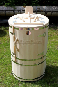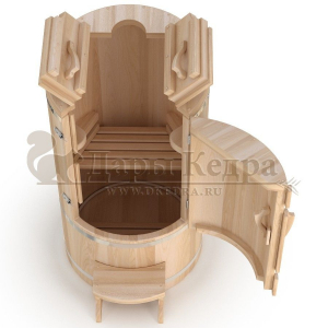 Готовый комплект - это полностью укомплектованный набор с фитобочкой для процедур парения. Круглая модель наиболее компактна и мобильна. Толщина стенок составляет 40-45 мм, что позволяет увеличить срок службы изделия. Бочка оборудована откидными створками, дверцей и отверстием для головы. Верхний скос делает положение головы более комфортным и улучшает обзор. Во время парения человек сидит внутри кедровой бочки, а голова находится снаружи. Благодаря этому исключается возможность перегрева. Подлокотники из кедра, встроенные ручки на створках и двери делают эксплуатацию более удобной.