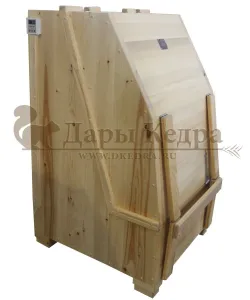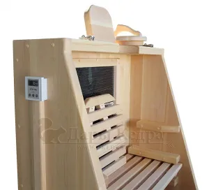 Квадратная двухрежимная фитобочка из кедра может быть использована как инфракрасная сауна и парная. Карбоновые излучатели отвечают за сухое парение, они находятся на внутренней стороне дверцы и задней стенке фитобочки. Влажное парение происходит за счет поступления горячего пара в фитобочку через паропровод. Толщина стенок составляет 40-45 мм, что позволяет увеличить срок службы изделия. Откидная дверь бочки во время открывания фиксируется внешней подставкой - опорой, которая в закрытом состоянии складывается и не занимает лишнее пространство. Во время парения человек сидит внутри кедровой бочки, а голова находится снаружи. Благодаря этому исключается возможность перегрева. Встроенная ручка на двери делают эксплуатацию фитобочки более удобной.