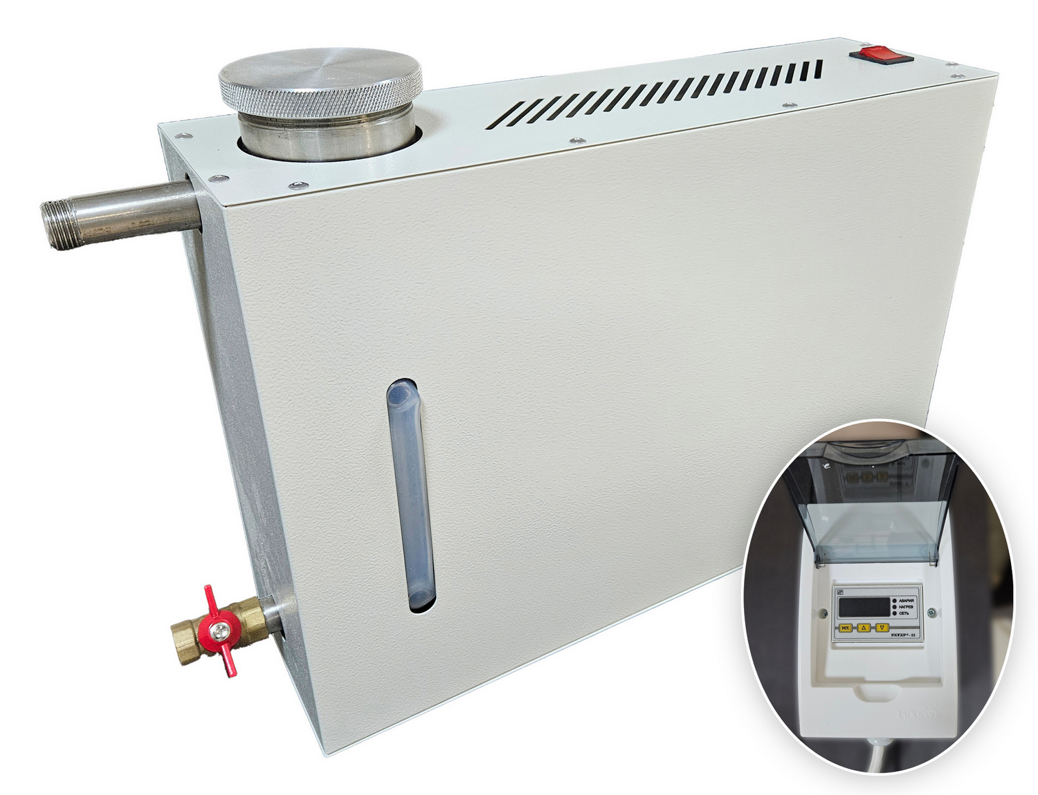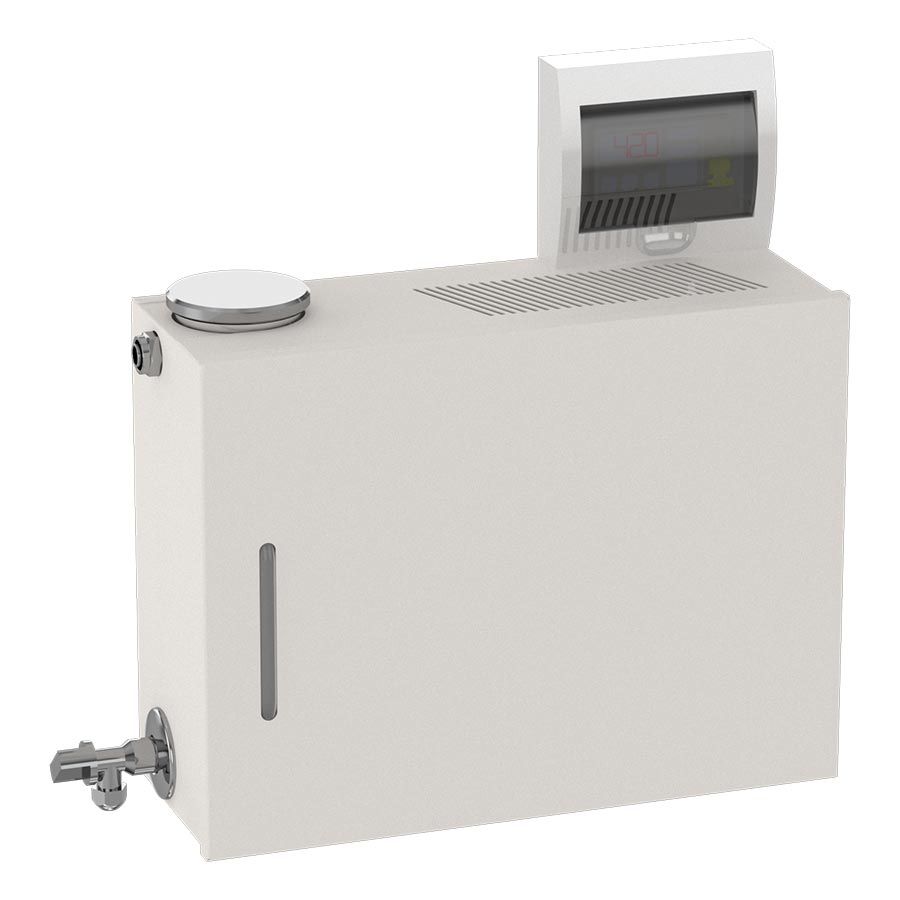 Парогенератор проточный c выносным/встроенным цифровым пультом управления, 9 кВт Проточные парогенераторы подключаются к водопроводу и автоматически добавляют воду в прибор при ее расходовании. Парогенератор служит для образования пара в саунах, хамамах, банях и душевых кабинах. Мощность стоит выбирать в зависимости от объема парной. Работа парогенератора осуществляется за счет встроенного или выносного пульта управления (на ваш выбор). Он позволяет устанавливать температуру, мощность и время процедур парения. При достижении необходимой температуры происходит автоматическое прекращение подачи тепла для нагрева воды. При снижении температуры более чем на 3°С температурный датчик снова включает подогрев. Таким образом время непрерывной работы парогенератора составляет более 12 часов. , ,