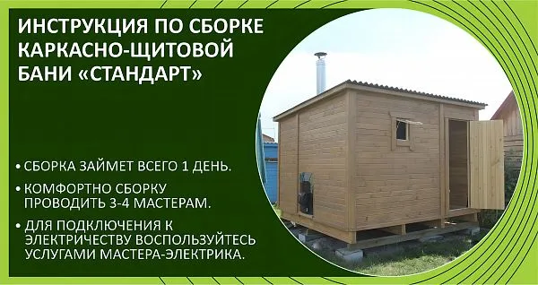 Каркасная или щитовая модель бани с каждым годом набирает всё большую популярность за счет своей скорости возведения, экономичности и доступности. Данная конструкция мобильна, не требует полноценного фундамента, а значит со временем при изменении ландшафтного дизайна на участке, может быть легко переставлена на другое место или вообще перевезена на другой участок. На ее конструкции и функциональности это никак не отразится. Щитовую конструкцию можно возводить в любое время года. Нанимать строительную бригаду нет необходимости, по инструкции от производителя со сборкой справится любой мужчина, без каких-либо столярных навыков. Только при себе необходимо иметь следующий инструмент: шуруповерт, рулетку, молоток, резиновую киянку 500-600 г, уровень, карандаш, битумный клей, кран для бака воды.